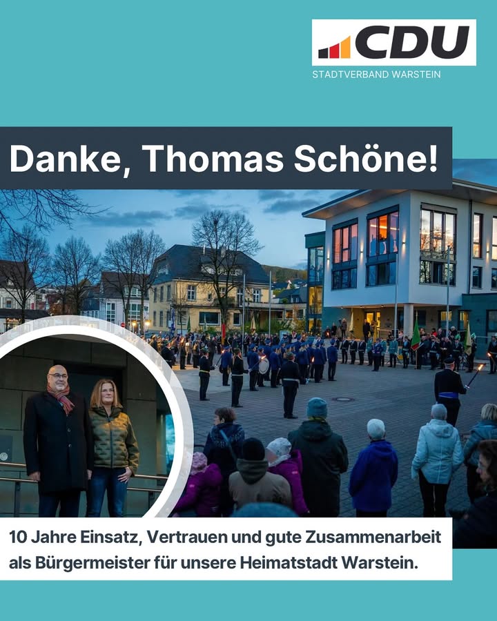 Danke, Thomas Schöne!Als CDU Warstein möchten wir uns bei dir, lieber Thomas, ganz herzlich für die vertrauensvolle, offene und stets konstruktive Zusammenarbeit in den vergangenen zehn Jahren bedanken!Gemeinsam haben wir viele Projekte auf den Weg gebracht, Herausforderungen gemeistert und unsere Stadt Stück für Stück weiterentwickelt. Der enge Austausch, dein offenes Ohr und dein Wille, Politik im Sinne der Menschen zu gestalten, haben die Zusammenarbeit mit dir besonders geprägt. In deiner Zeit als Bürgermeister warst du rund um die Uhr im Einsatz und hast dich für den engen Zusammenhalt aller Ortsteile stark gemacht.Unter deiner Führung ist es gelungen, parteiübergreifend gute Entscheidungen zu treffen, die Kommunalpolitik sachlich und lösungsorientiert zu gestalten und Fördermittel in nie dagewesenem Umfang für Warstein zu gewinnen. Du hast den Geist geweckt, dass in Warstein Veränderung möglich ist, und gezeigt, dass Teamarbeit, Vertrauen und gegenseitiger Respekt die Grundlage erfolgreicher Politik sind. Ebenso ist es dir gelungen, junge Menschen für Politik zu begeistern und sie für ein Engagement in unserer Heimat zu motivieren.Jetzt beginnt für dich eine neue Phase ? Zeit für Familie, Freunde und neue Wege.Wir danken dir (und deiner Frau!) von Herzen für deinen Einsatz, deine Authentizität, deinen Teamgeist und deinen unermüdlichen Willen, Warstein voranzubringen. Für die Zukunft wünschen wir dir alles Gute, Gesundheit und weiterhin viel Energie bei allem, was du anpackst!#CDUWarstein #Warstein #Kommunalpolitik @thoschoene