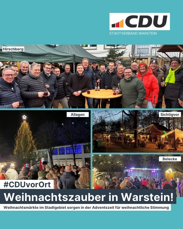 ✨🎄 Weihnachtszauber in Warstein! 🎄✨Die stimmungsvollen Weihnachtsmärkte in unserer schönen Stadt waren auch in diesem Jahr wieder ein echtes Highlight der Vorweihnachtszeit! ❄️🌟 BeleckeIn einzigartiger Atmosphäre am Haus Welschenbeck lockte der Weihnachtsmarkt mit gemütlichem Budenzauber, Glühwein, weihnachtlichen Köstlichkeiten und einem abwechslungsreichen Rahmenprogramm. 🎆🍷🌟 Allagen"Deutschlands kleinster Weihnachtsmarkt" war auch in diesem Jahr wieder ein Highlight in der Allagener Ortsmitte. Der Besuch vom Nikolaus sorgte für zahlreiche glückliche Kinderaugen. 🎅🎶🌟 SichtigvorEine gelungene Premiere feierte in diesem Jahr der Weihnachtsmarkt im Ostwaldpark, der durch die KG MüSiWA ins Leben gerufen wurde. Mit jeder Menge ehrenamtlichem Engagement und beispielhafter Vereinsarbeit sorgten alle Beteiligten gemeinsam für zwei stimmungsvolle Tage und ein gemütliches Beisammensein. Über eine Fortführung in den kommenden Jahren freuen wir uns sehr.🎄✨🌟 HirschbergDer romantische Weihnachtsmarkt im historischen Ortskern verzauberte mit festlich beleuchteten Fachwerkhäusern, liebevoll dekorierten Ständen und leckeren Köstlichkeiten. Gerne sind wir der Einladung der CDU-Ortsunion Hirschberg gefolgt. Gemeinsam mit Jörg Blöming MdL, unserem Bürgermeister Maximilian Spinnrath und dem Bürgermeister der Gemeinde Lippetal, Tobias Nillies, haben wir einen schönen Nachmittag bei Glühwein und Reibeplätzchen verbracht. ☕️🕯️Es ist schön zu sehen, welche besondere weihnachtliche Stimmung durch ehrenamtliches Engagement geschaffen werden kann. Vielen Dank an alle involvierten Vereine, Initiativen und Besucher. Darauf können wir als Stadt wirklich stolz sein. 🤍🎄📸 Teilt eure schönsten Weihnachtsmarktmomente gerne in den Kommentaren mit uns ? wir freuen uns auf eure Highlights! 📷✨#CDUWarstein #CDU #Warstein